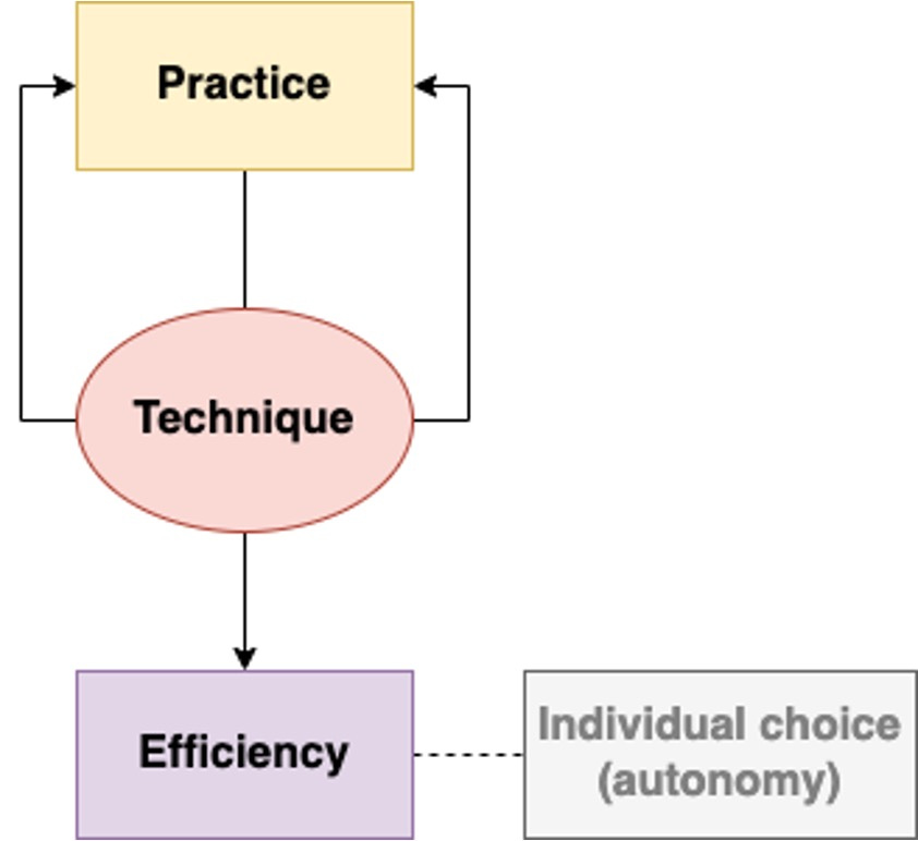 You might think I’ve misunderstood something. I’ve drawn that the modified practice of medicine results in, even aims for, efficiency, not autonomy. But this is the trick we’ve played on ourselves. By trying to replace health with autonomy as the purpose of medicine, we destabilized the system at a time when, as Jacques Ellul and Neil Postman have documented, technique in service to efficiency was on the rise. I use the term “technique” the way Ellul did, to describe something that aims entirely at efficiency. In situating the individual as the source of moral authority, we’ve done away with any consideration of ends and focus entirely on means. The soil is perfect for the seed of efficiency to take root.